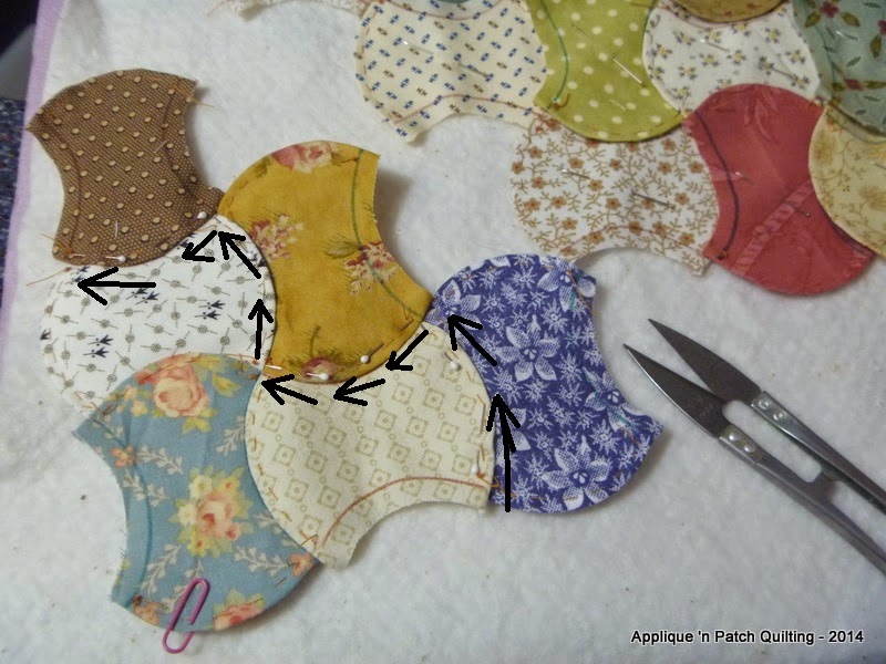 Place the templates in this order. You need a dark, medium and light to make a triangle. You have to be aware of placing each piece so that you don't have a light against a light, etc. At the sides (see the two arrows), you will need to open up some of the shorter seams that were basted (and this is why it was important to allow the 1/4" seam allowance)